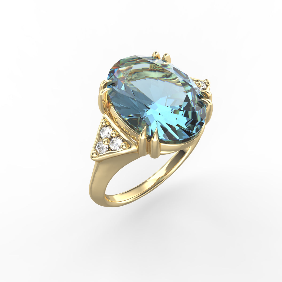 14 karat yellow gold polish-finished cocktail ring, centered with a 12x10mm oval-shaped faceted 4.8ct blue topaz semi-precious color stone, and accented with 0.09 carats of bezel set diamonds