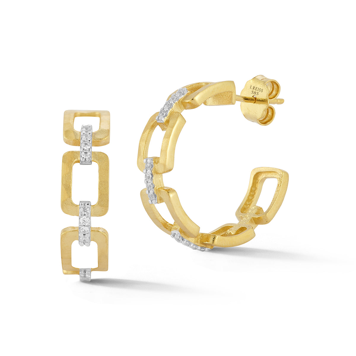 14 karat yellow gold matte and hammer-finished 22mm open rectangular link hoop earrings, accented with 0.15 carats of pave set diamonds